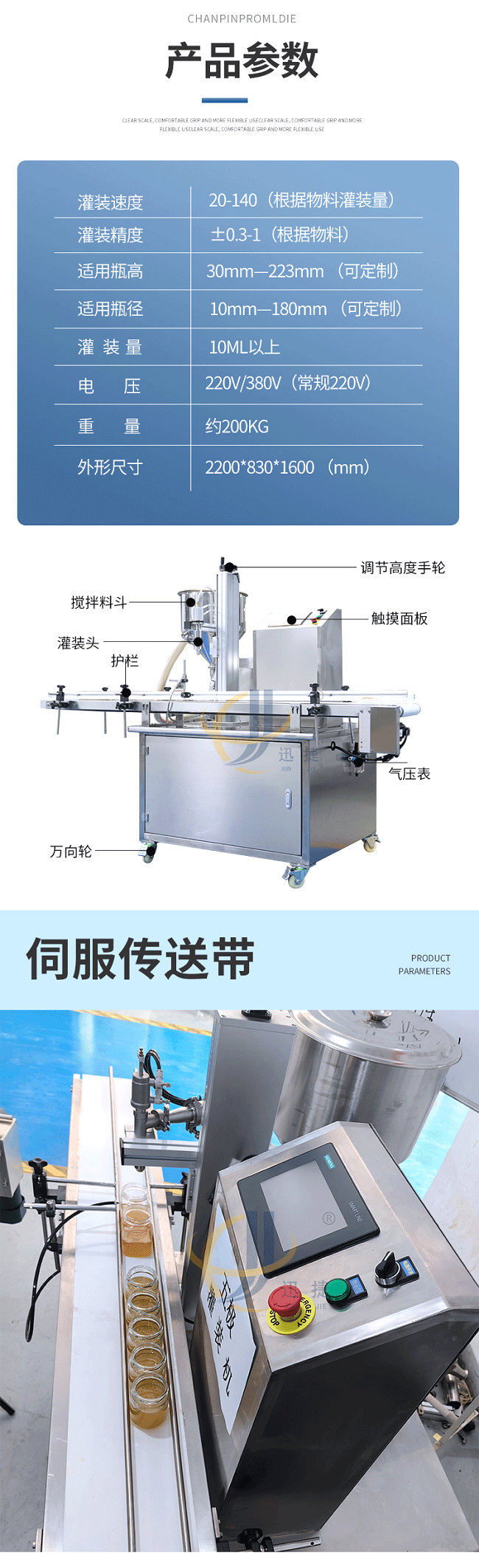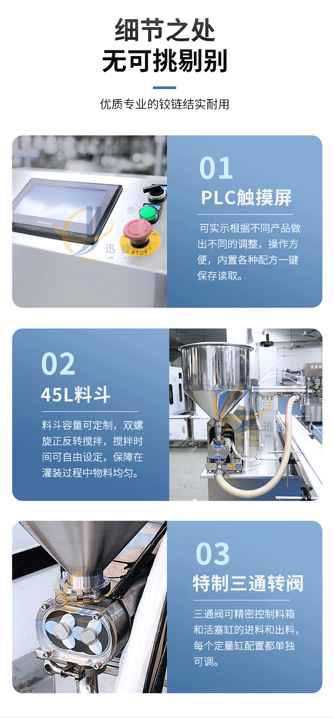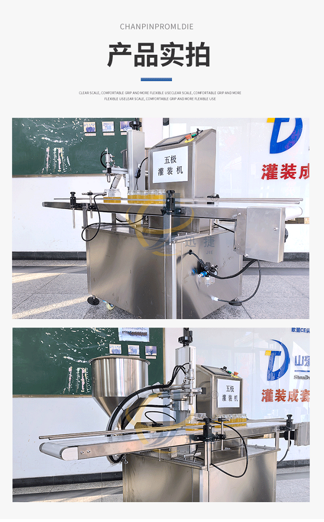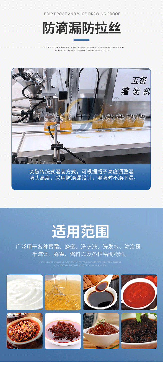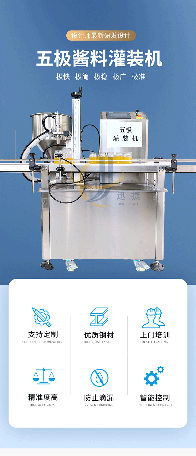 我公司新研發五極醬料灌裝機,五極分為極快,極簡,極穩,極廣,極準,廣泛適用于各種膏霜、蜂蜜、洗衣液、洗發水、半流體、蜂蜜、醬料以及各種粘稠物料,該產品支持定制,選用306不銹鋼材質,灌裝精度高,防止滴漏,選用plc觸屏智能控制,防滴漏防拉絲,突破傳統的灌裝方式,可根據瓶子高度調整灌裝頭高度,采用防滴漏設計,灌裝時不滴不漏。
